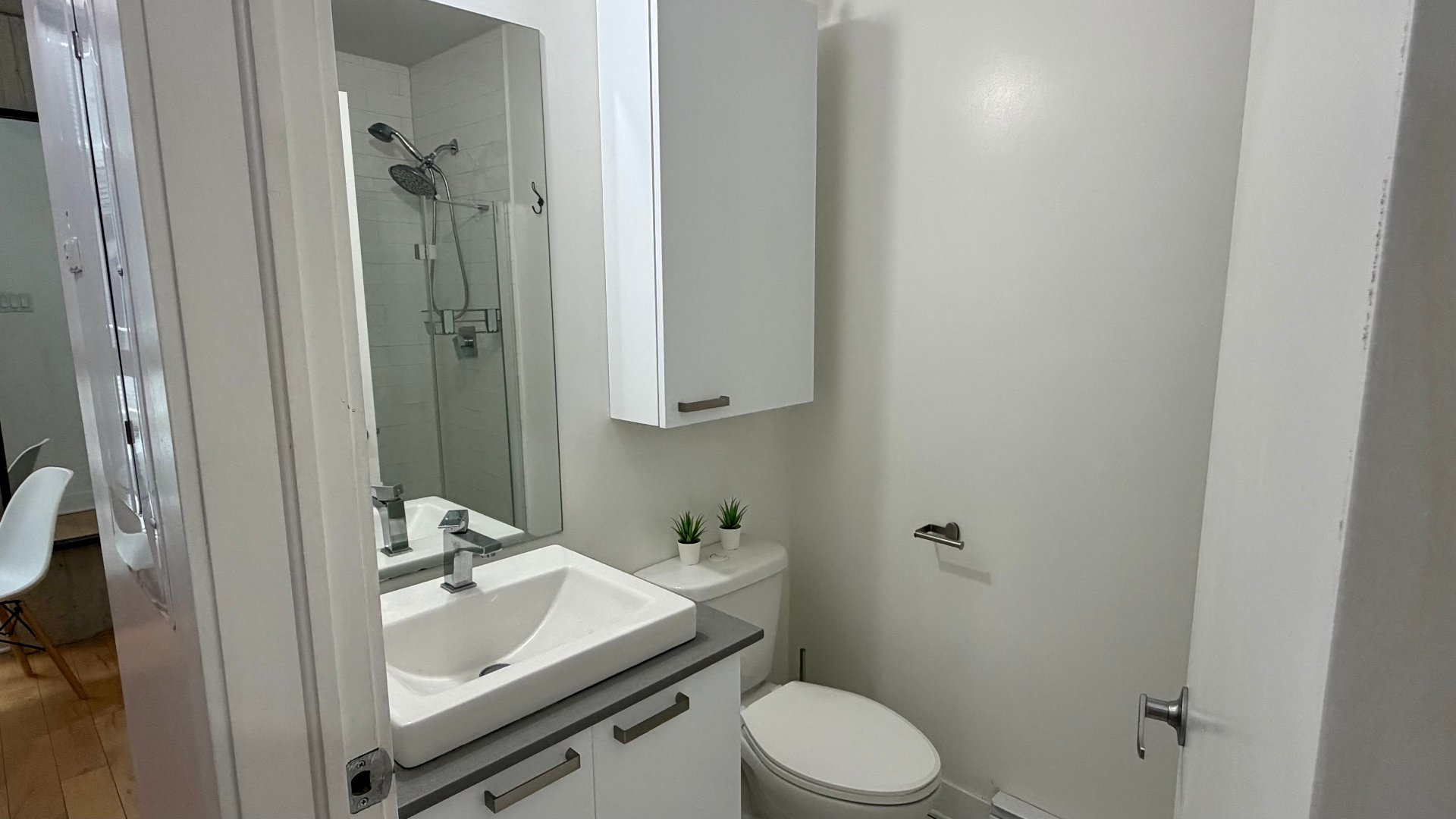 shower doors and stainless steel fixtures. Wall-mounted air